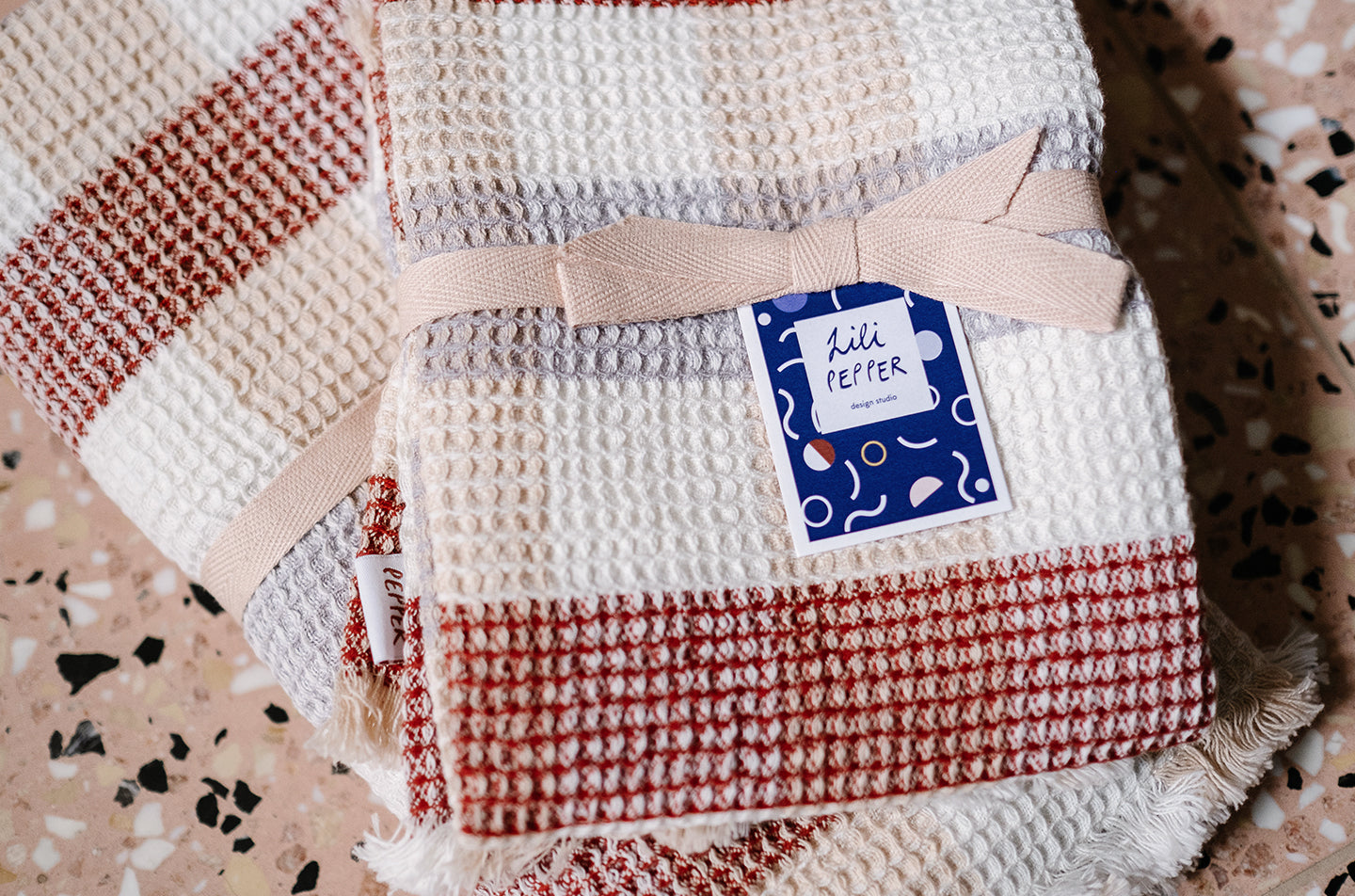 The towels made of 100% organic cotton in a waffle weave structure are a pretty accessory for your bathroom. They are available in two different check color combinations and can be combined with each other.